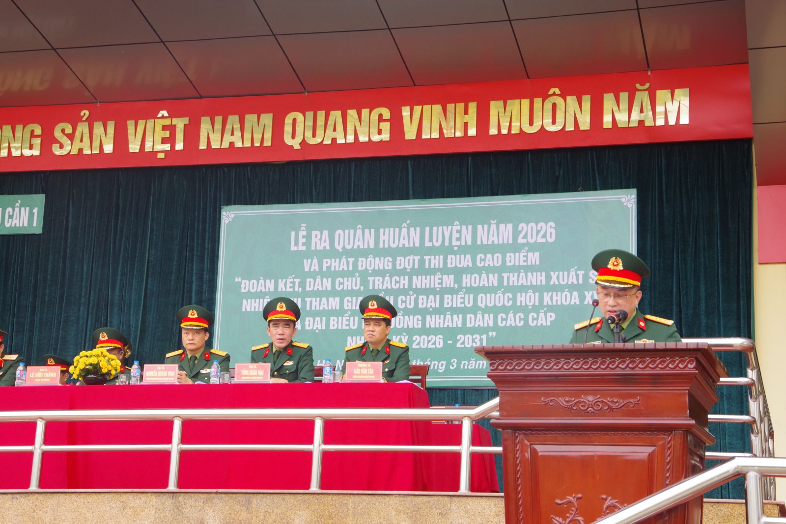 Tiếp đó, đồng chí Đại tá Bùi Xuân Dũng, Bí thư Đảng ủy, Chính ủy Nhà trường đã phát động 4 phong trào thi đua trong Lễ ra quân huấn luyện năm 2026, gồm: phong trào thi đua huấn luyện năm 2026; đợt thi đua cao điểm lập thành tích chào mừng bầu cử đại biểu Quốc hội khóa XVI và bầu cử đại biểu Hội đồng nhân dân các cấp nhiệm kỳ 2026 – 2031, chào mừng kỷ niệm 136 năm Ngày sinh Chủ tịch Hồ Chí Minh (19/5/1890 – 19/5/2026); Phong trào thi đua “Toàn dân bảo vệ an ninh Tổ quốc”; phong trào thi đua “Dân vận khéo”, xây dựng “Đơn vị dân vận tốt” và triển khai Quy trình xây dựng mô hình “Dân vận khéo” giai đoạn 2026 – 2030, Các phong trào thi đua phát động trong Lễ ra quân huấn luyện ngày hôm nay có ý nghĩa sâu sắc, là hoạt động trọng điểm trong phong trào thi đua Quyết thắng năm 2026 của Nhà trường.