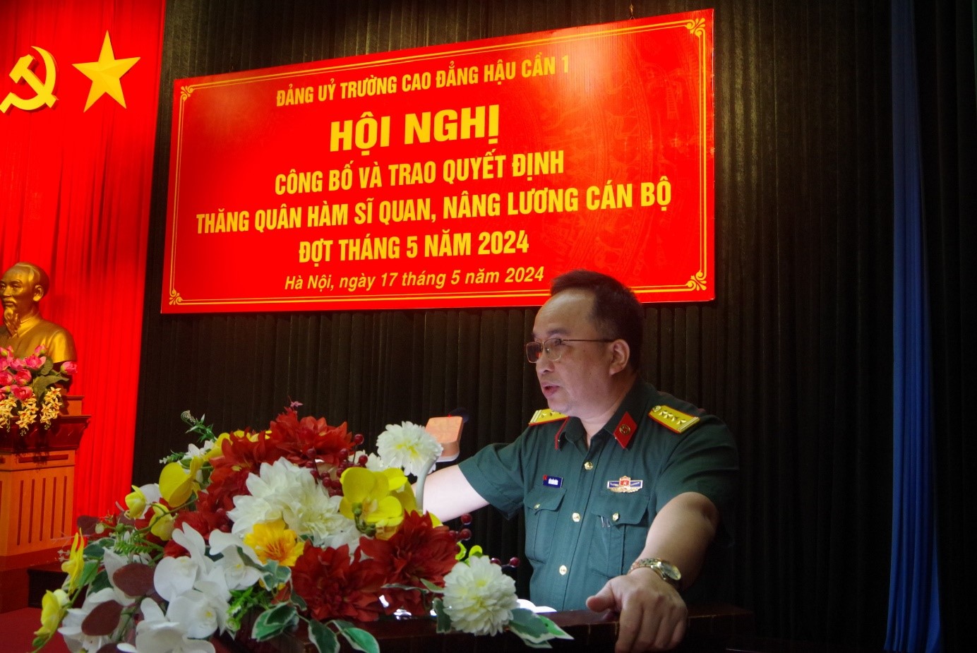 Thực hiện các quyết định của Thủ trưởng Tổng cục Hậu cần, ngày 17/5, Đảng ủy Trường Cao đẳng Hậu cần 1 tổ chức Hội nghị công bố và trao quyết định thăng quân hàm sĩ quan, nâng lương cán bộ đợt tháng 5 năm 2024. Đại tá Bùi Xuân Dũng, Bí thư Đảng ủy, Chính ủy Nhà trường chủ trì hội nghị.