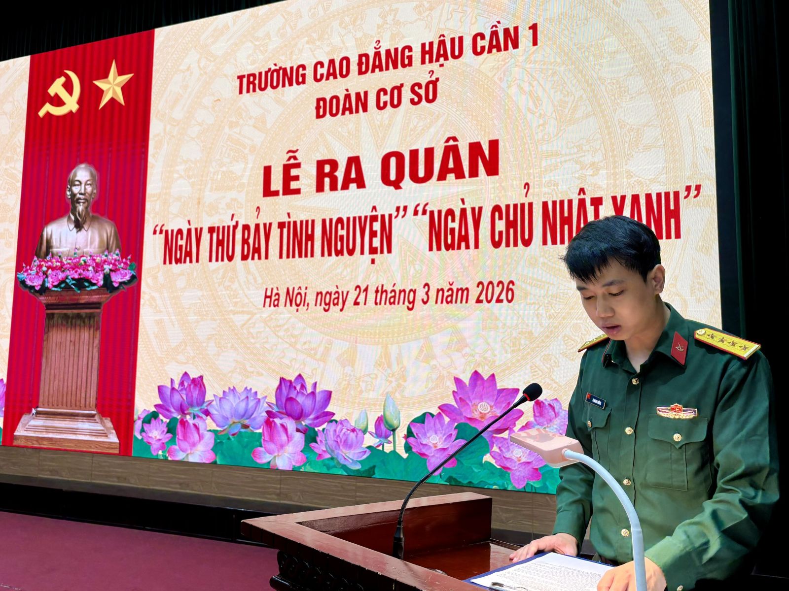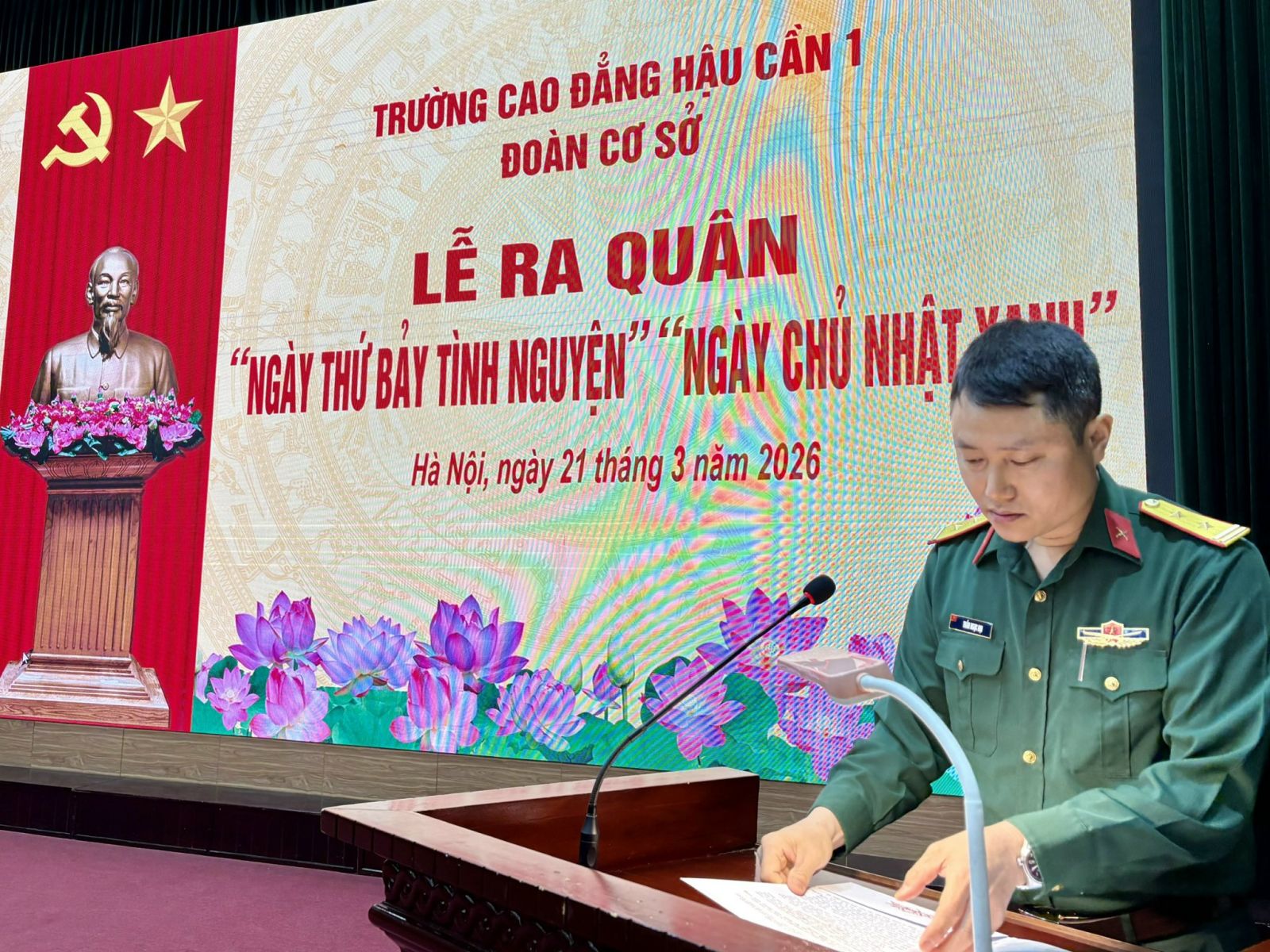 Sáng 21-3-2026, Đoàn cơ sở Trường Cao đẳng Hậu cần 1 tổ chức Lễ ra quân “Ngày thứ Bảy tình nguyện – Ngày Chủ nhật xanh” hưởng ứng “Tháng Thanh niên”, hướng tới kỷ niệm 95 năm Ngày thành lập Đoàn TNCS Hồ Chí Minh. Dự và chỉ đạo buổi lễ có đồng chí Trung tá Trần Ngọc Đại, Phó Chủ nhiệm Chính trị Nhà trường; đại diện chỉ huy các tiểu đoàn: Tiểu đoàn 1, Tiểu đoàn 2, Tiểu đoàn 512; Ban Chấp hành Đoàn cơ sở cùng 100% cán bộ, đoàn viên thanh niên trong toàn trường.