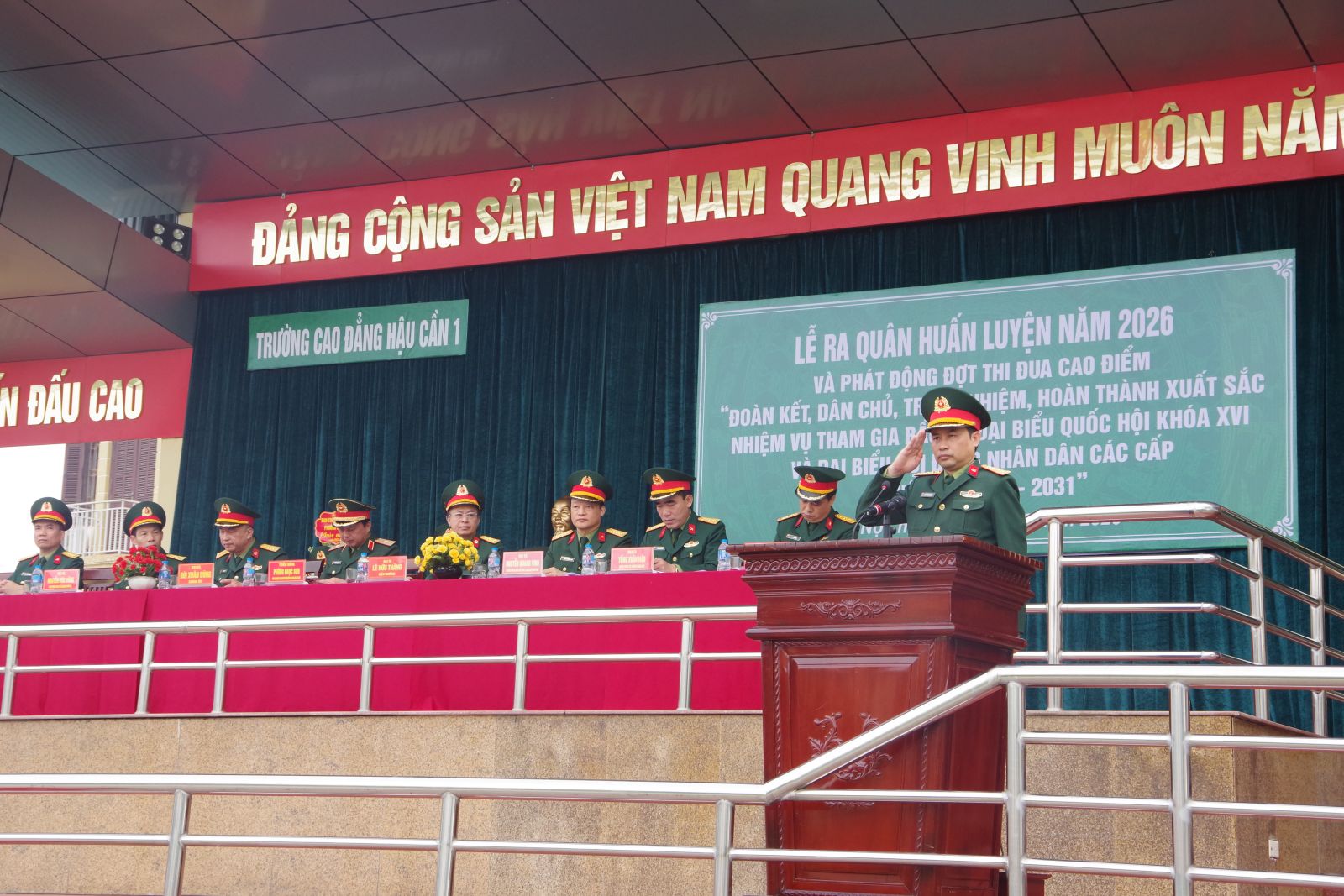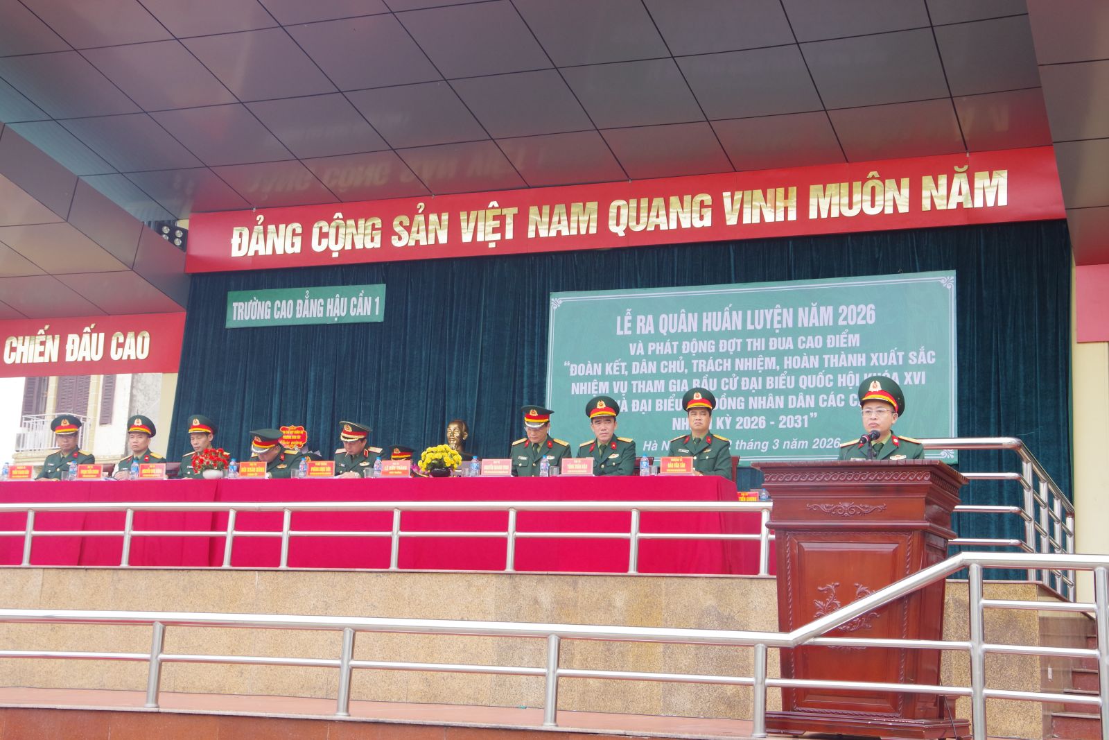 Sáng 02-3, tại Hà Nội, Trường Cao đẳng Hậu cần 1, Tổng cục Hậu cần – Kỹ thuật ( HC-KT) tổ chức Lễ ra quân huấn luyện năm 2026 và phát động đợt thi đua cao điểm với chủ đề “Đoàn kết, dân chủ trách nhiệm, hoàn thành xuất sắc nhiệm vụ tham gia bầu cử đại biểu Quốc hội khóa XVI và đại biểu HĐND các cấp nhiệm kỳ 2026 – 2031”. Thiếu tướng Phùng Ngọc Sơn, Phó Chủ nhiệm, Tham mưu trưởng Tổng cục Hậu cần - Kỹ thuật chủ trì buổi lễ. Tham dự buổi Lễ có đồng chí Đại tá Lê Hữu Thăng, Phó bí thư Đảng ủy, Hiệu trưởng Nhà trường; Đại tá Bùi Xuân Dũng, Bí thư Đảng ủy, Chính ủy Nhà trường; các đồng chí trong Đảng ủy, Ban Giám hiệu Nhà trường; đại biểu các cơ quan, đơn vị kết nghĩa; cùng toàn thể cán bộ, giảng viên, học viên, sinh viên, chiến sĩ trong toàn trường.