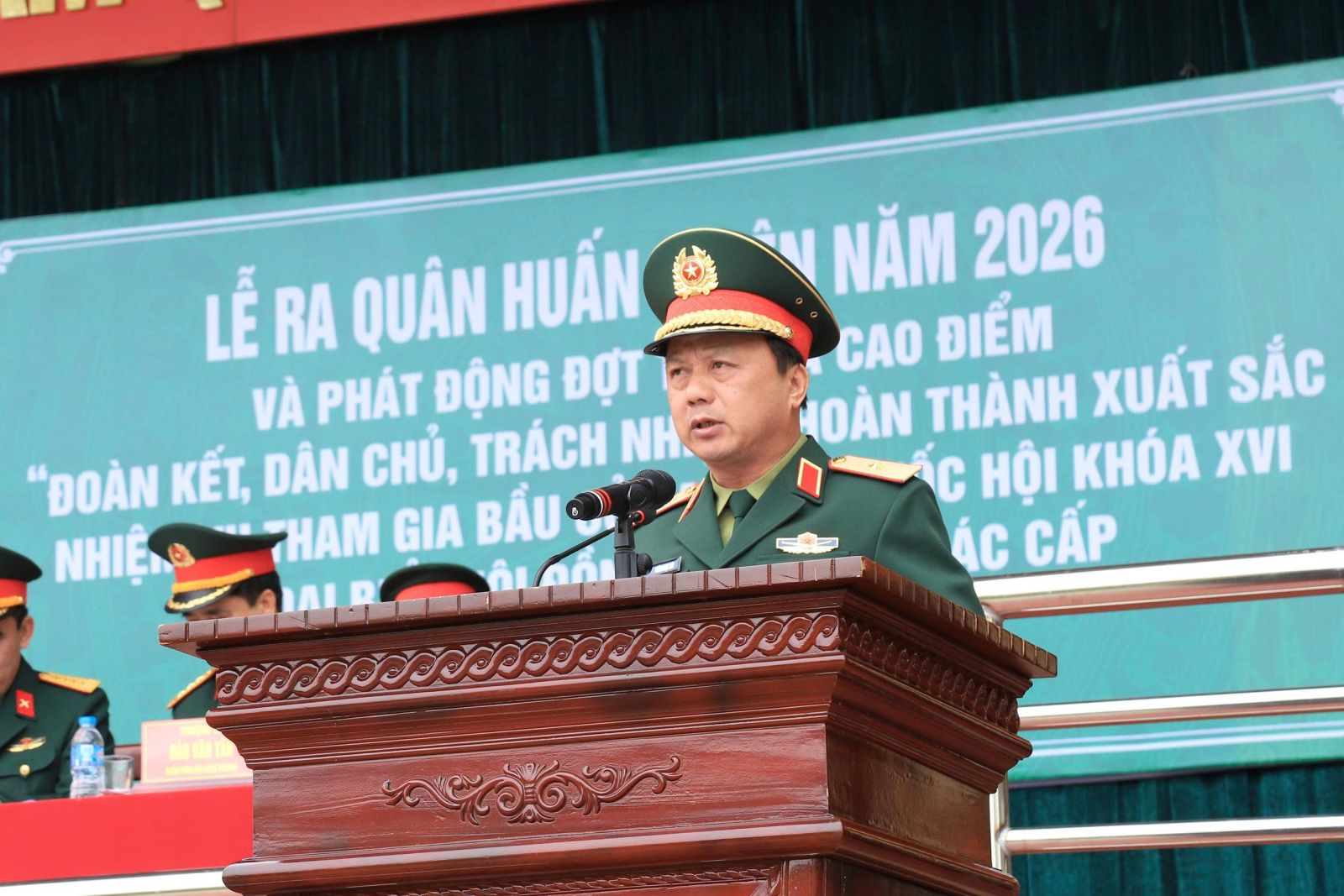 Tiếp đó, đồng chí Đại tá Bùi Xuân Dũng, Bí thư Đảng ủy, Chính ủy Nhà trường đã phát động 4 phong trào thi đua trong Lễ ra quân huấn luyện năm 2026, gồm: phong trào thi đua huấn luyện năm 2026; đợt thi đua cao điểm lập thành tích chào mừng bầu cử đại biểu Quốc hội khóa XVI và bầu cử đại biểu Hội đồng nhân dân các cấp nhiệm kỳ 2026 – 2031, chào mừng kỷ niệm 136 năm Ngày sinh Chủ tịch Hồ Chí Minh (19/5/1890 – 19/5/2026); Phong trào thi đua “Toàn dân bảo vệ an ninh Tổ quốc”; phong trào thi đua “Dân vận khéo”, xây dựng “Đơn vị dân vận tốt” và triển khai Quy trình xây dựng mô hình “Dân vận khéo” giai đoạn 2026 – 2030, Các phong trào thi đua phát động trong Lễ ra quân huấn luyện ngày hôm nay có ý nghĩa sâu sắc, là hoạt động trọng điểm trong phong trào thi đua Quyết thắng năm 2026 của Nhà trường.
