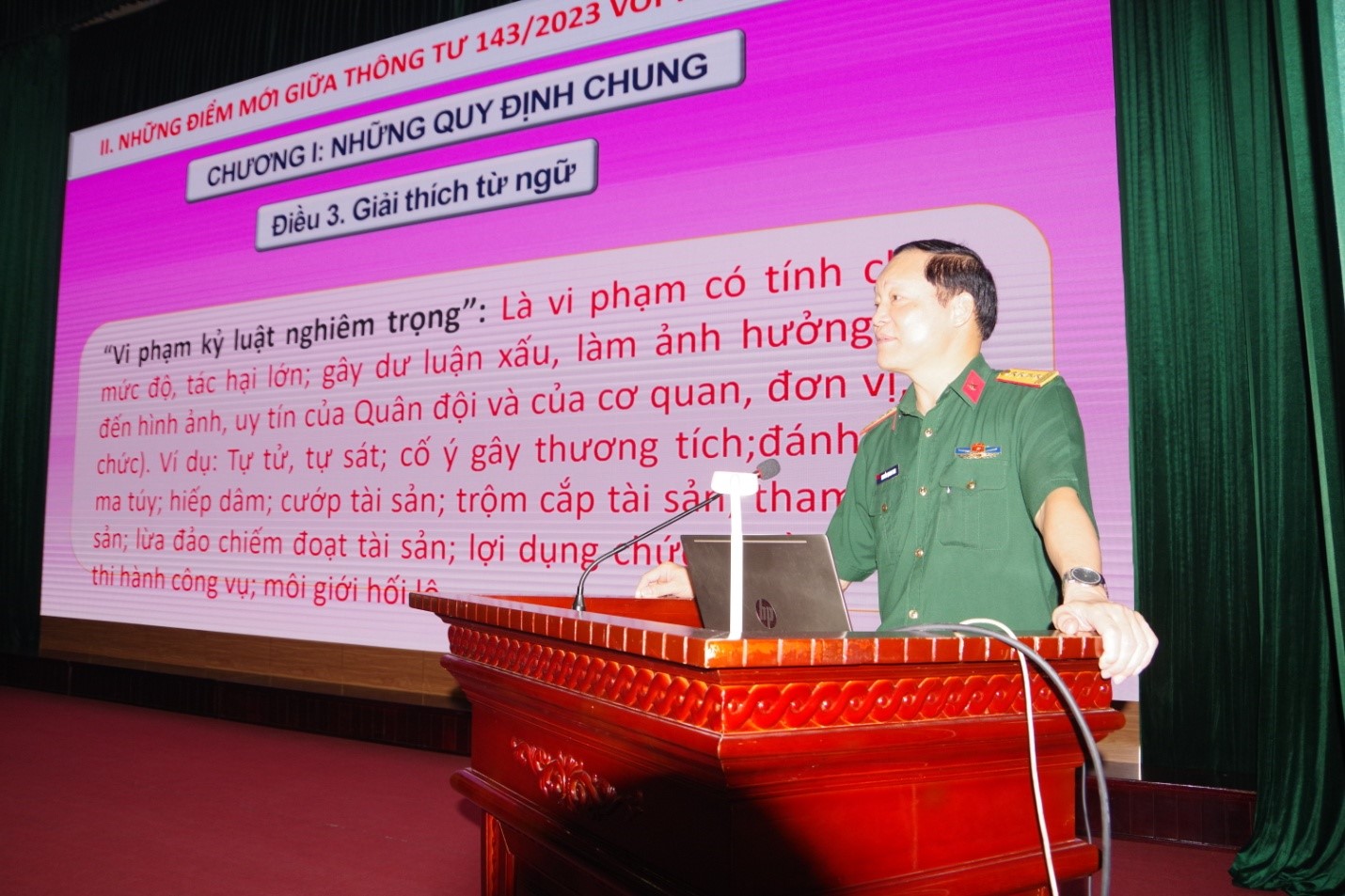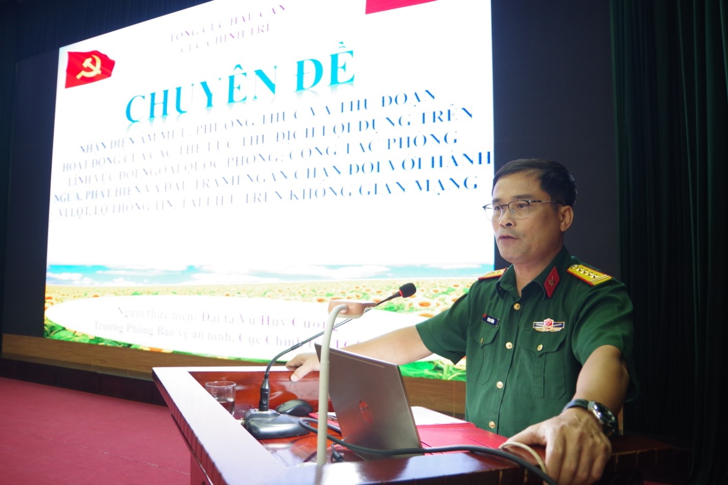 Thực hiện chương trình làm việc, các đồng chí trong Tổ Báo cáo viên pháp luật của Tổng cục đã truyền đạt lần lượt các chuyên đề: (1)Những nội dung cơ bản của Thông tư số 143/2023/TT-BQP ngày 27 tháng 12 năm 2023 của Bộ Quốc phòng quy định xử lý kỷ luật trong Quân đội nhân dân Việt Nam; (2) Dấu hiệu nhận biết, thực trạng của tội phạm sử dụng công nghệ cao hiện nay và giải pháp phòng ngừa; (3) Nhận diện âm mưu, phương thức và thủ đoạn hoạt động của các thế lực thù địch lợi dụng trên lĩnh vực đối ngoại quốc phòng; một số điểm chú ý trong quan hệ tiếp xúc người nước ngoài theo Thông tư số 152 của Bộ Quốc phòng; (4) Thông báo khái quát tình hình thế giới, khu vực, trong nước và hoạt chống phá của các thế lực thù địch; định hướng tư tưởng, dư luận cho cán bộ, chiến sĩ, người lao động.